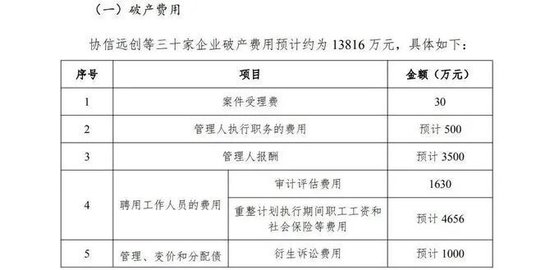 本次破产重整,管理人报酬预计达到了3500万元、审计评估费用达1630万元。
