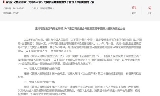 2025年7月16日,全国企业破产重整案件信息网刊登了《宝塔石化集团等167家公司实质合并重整案关于管理人报酬方案的公告》,详细披露了管理人报酬的确定过程。